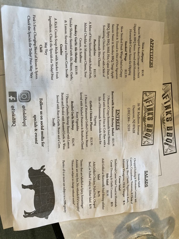 Introducing the menu at Fink’s BBQ Smokehouse, a Cajun/Creole - American - Barbeque joint located in Dumont, NJ. Known for its diverse menu featuring many vegetarian options, Fink’s also offers delivery, takeout, and catering services. Customers rave about the strong and flavorful drinks, smoked wings, tender ribs, and spicy beef brisket sandwiches. The ambiance, with a full bar, pool table, and live music, adds to the dining experience. While some customers mention minor cons like street parking and occasional delays in food service, overall, Fink’s impresses with its tasty offerings and friendly service. The menu features a mix of traditional barbecue dishes and unique specials, making it a must-visit spot for BBQ enthusiasts in Bergen County. If you’re craving delicious, budget-friendly BBQ with a side of charm, Fink’s BBQ Smokehouse is the place to be.